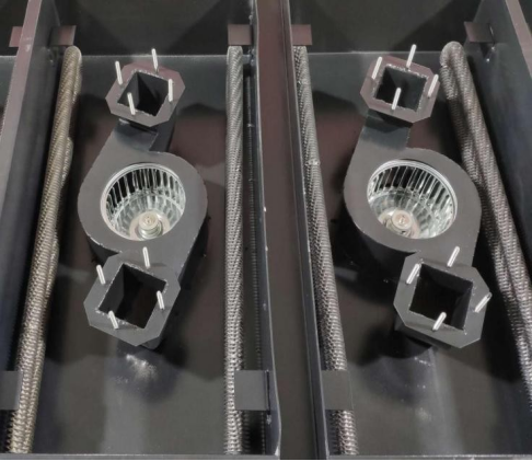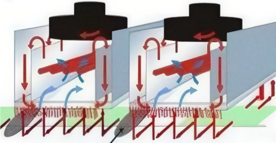 晉力達(dá)自行研發(fā)熱風(fēng)循環(huán)技術(shù),通過高溫馬達(dá)+風(fēng)葉吹風(fēng),使發(fā)熱管加熱變?yōu)闊犸L(fēng),側(cè)位回風(fēng)形成循環(huán),熱風(fēng)結(jié)構(gòu)熱傳遞效率顯著提升(30–50W/m2K),消除了陰影效應(yīng)和顏色對吸熱的影響,成為當(dāng)時主流技術(shù)。