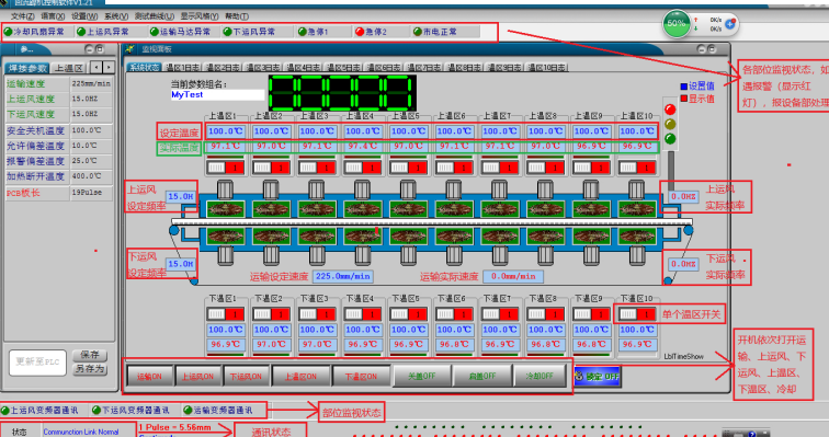(4)爐溫參數(shù)設(shè)置:檢查系統(tǒng)畫面參數(shù)與設(shè)置是否相符,參數(shù)設(shè)定根據(jù)產(chǎn)品調(diào)節(jié)各溫區(qū)溫度;注意修改完參數(shù)以點擊